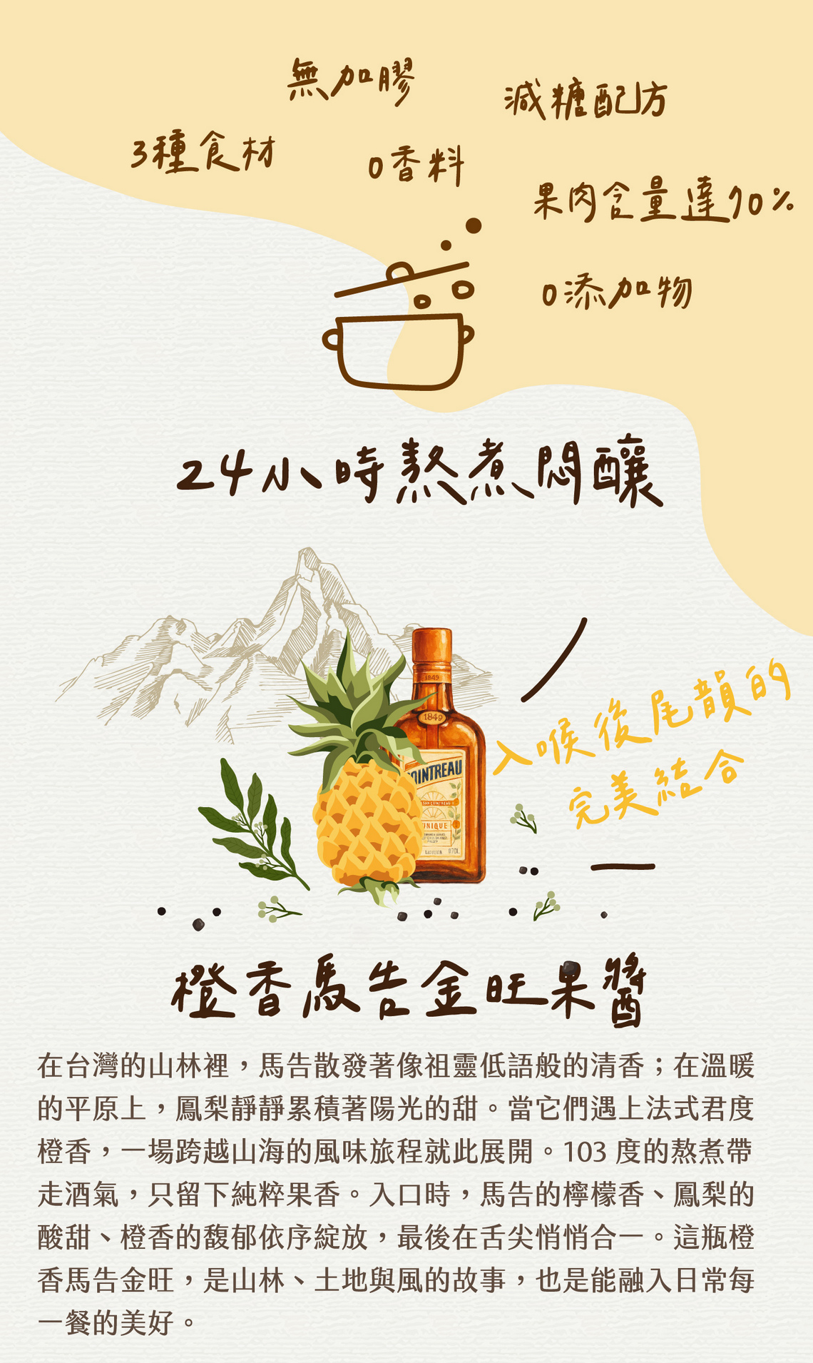 經過了二次高達103度的熬煮後,帶走了酒氣,留下了馥郁的橙香,完美的融入馬告與鳳梨之中。