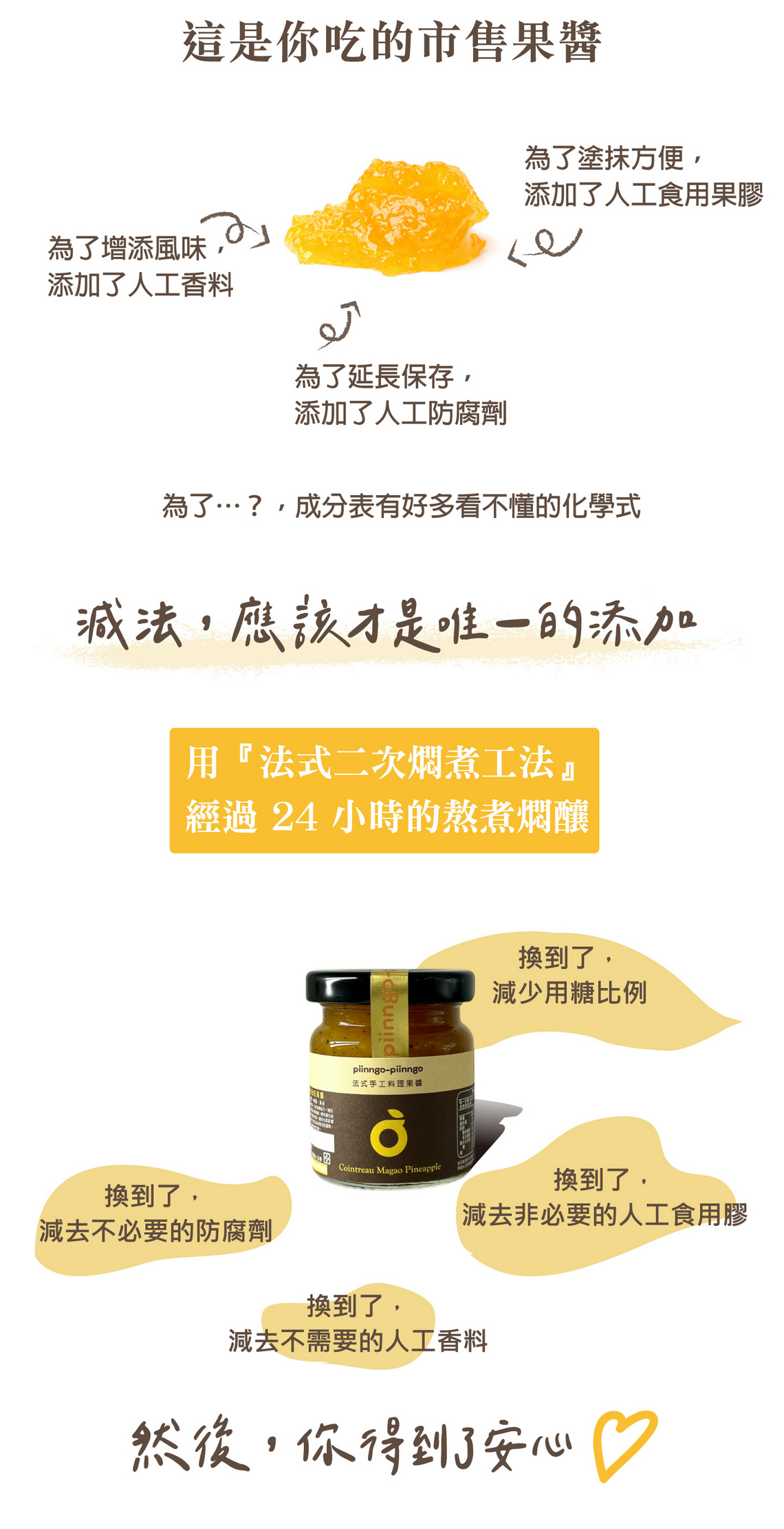 我們遵從正統法式二次燜煮工法的同時,在手工果醬的質地、香氣、比例上,一再精雕細琢,研發出適合國人料理的『piinngo-piinngo 法式手工料理果醬』!